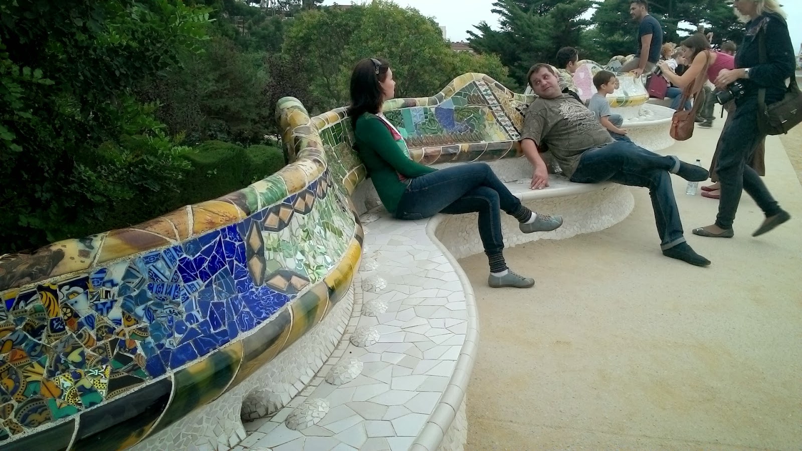 The unique shape of the serpentine bench enables the people sitting on it to converse privately, although the square is large. The bench is tiled and in order to dry up quickly after it rains, and to stop people from sitting in the wet part of the bench, small bumps were installed by Gaudí.