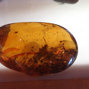 I decided that I wanted not only a piece of amber but a piece that had an insect in it. I wanted to wear history. I found an interesting piece at a local jewellery store. We took it back to the museum to have them verify (under a black light) that it was a genuine piece of amber. It appeared cloudy which shows it was the real thing. Next, we had them put a clasp on it so I could wear it as a pendant. Looking under a microscope showed that there were two insects in my piece. I was one happy camper.