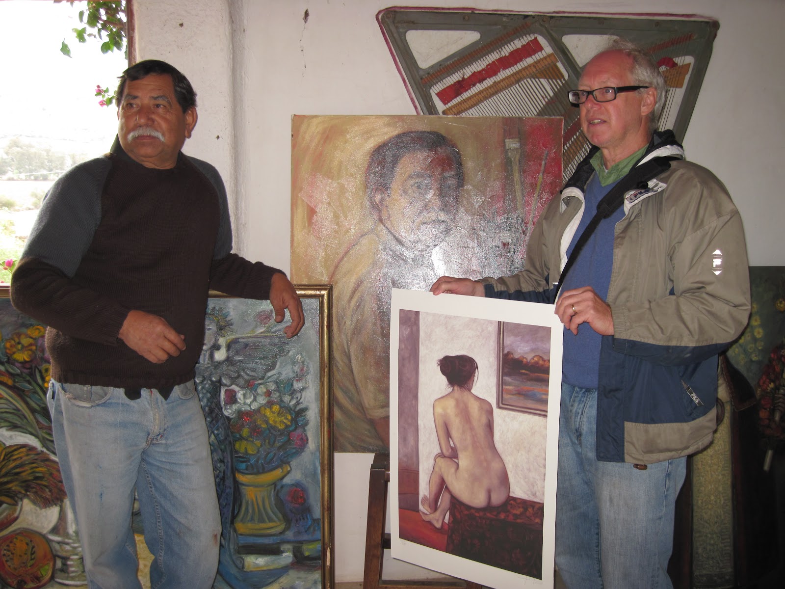 artist at right with his self-portrait and another painting